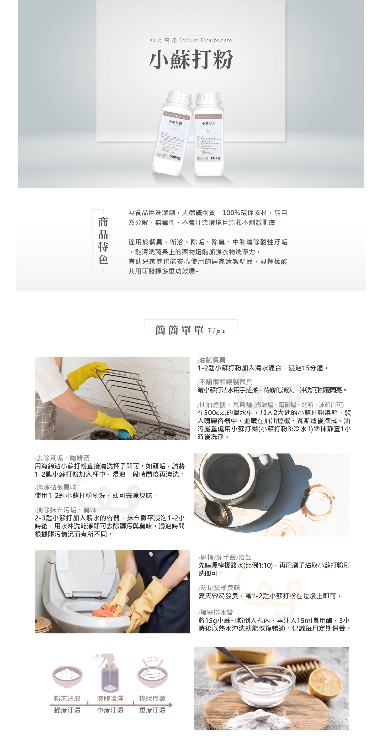可適用於餐具、衛浴清潔、除垢、除臭、中和清除酸性汙垢,能清洗蔬果上的藥物還能加強衣物洗淨力。